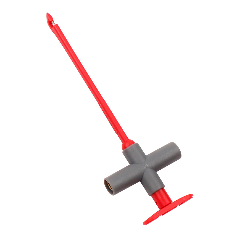 在某些情況下無法無法找到被測點而必須破開電線外皮對信號測試時,可以方便地使用這個工具,ETA3410全絕緣快速穿孔測試夾可穿透1.5至4毫米絕緣電線,獨特的V型線槽設計,確保測針的位置保持在電纜中間,尾部4mm插座可與萬用表或示波器的測試引線一起使用,簡單,安全,高效。使用方法就將4mm測試線纜插入穿刺測針的末端,測試電纜放入V型線槽中,松開按鈕,測試工具內的一個非常精細的探頭可以刺穿電纜護套和內導體直接接觸,從而在電纜內部進行信號快速無損檢測,測試后,松開按鈕,拆下電線,電纜護套留下針孔很容易密封,優質絕緣層可實現絕緣自愈。