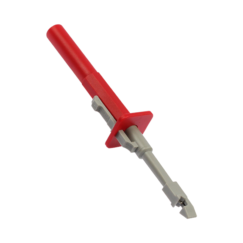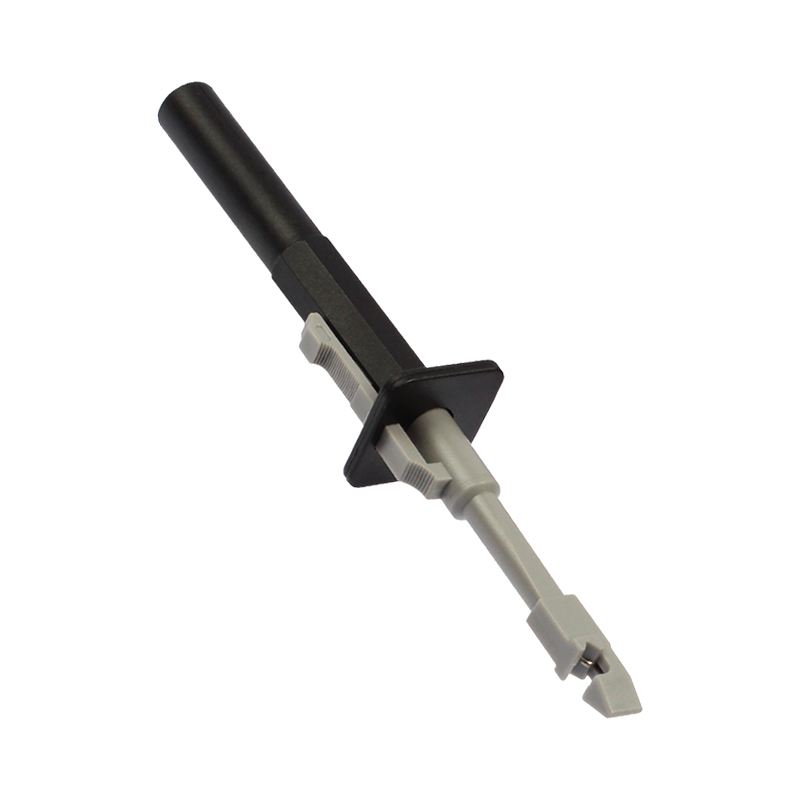 在某些情況下無法無法找到被測點而必須破開電線外皮對信號測試時,可以方便地使用這個工具,ETA3404獨特的V型線槽設計,確保測針的位置保持在電纜中間,尾部4mm插座可與萬用表或示波器的測試引線一起使用,簡單,安全,快捷。使用方法就將4mm測試線纜插入穿刺測針的末端,測試電纜放入V型線槽中,釋放按鈕并測試,此時尖銳的測針可以直接刺穿電纜護套到導體,從而對電纜信號進行無損檢測,測試后,松開按鈕拆下電線,電纜護套留下針孔很容易密封,優(yōu)質絕緣層可實現(xiàn)絕緣自愈。