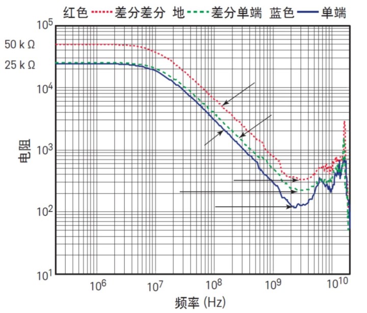 圖 8 是差分探頭和單端探頭的輸入阻抗 ( 幅值 ) 圖。紅色軌跡是施加差分源時所看到的差分探頭阻抗。綠色軌跡是施加單端源時看到的差分探頭阻抗,藍色軌跡是施加單端源時看到的單端探頭阻抗。圖 8 中標注了這三種情況的直流電阻、電容和最小電感值。應(yīng)注意差分探頭和單端探頭對單端信號的輸入阻抗很類似。